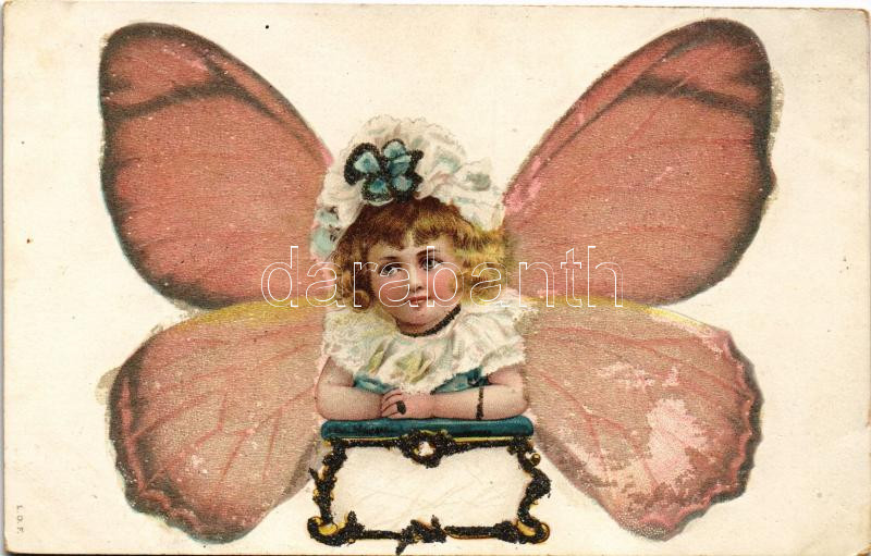 Leírás: Pillangó kislány motívumlap gyöngy és csillám díszítéssel / butterfly girl motive postcards with pearl and glitter decoration, litho (EK)