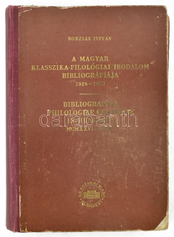 Borzsák István: A magyar klasszika-filológiai irodalom bibliográfiája. 1926-1950. Bp., 1952, Akadémiai Kiadó, 424 p. Kiadói aranyozott félvászon-kötés, kissé sérült borítóval, helyenként sérült lapszélekkel, az utolsó két lap kijár.