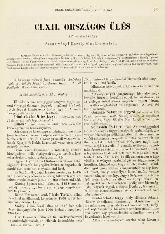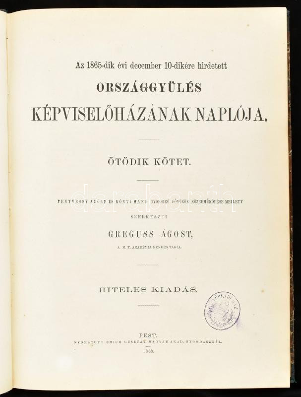 Az 1865-dik évi december 10-dikére hirdetett Országgyülés képviselőházának naplója. V kötet. Szerk.: Greguss Ágost. Hiteles kiadás. Pest, 1866, Emich Gusztáv, XIII+(2)+369 p. Korabeli, aranyozott gerincű félvászon-kötésben, kissé kopott borítóval, foltos gerinccel, benne a Főrendiház címeres bélyegzőivel.