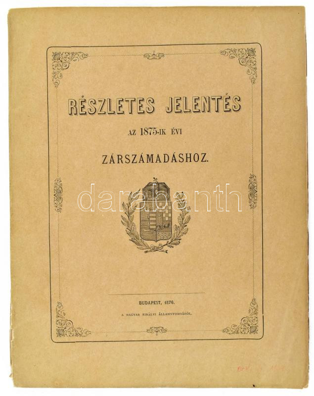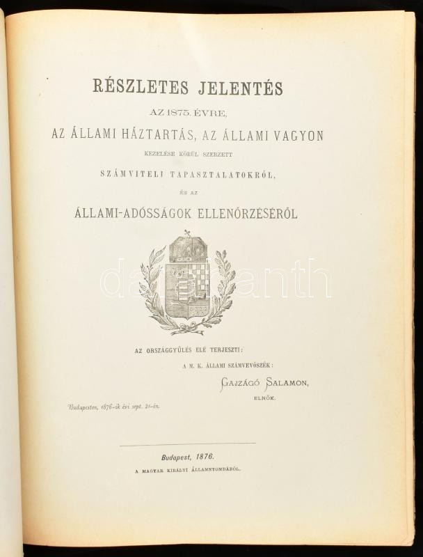 Részletes jelentés az 1875. évre, az állami háztartás, az állami vagyon kezelése körül szerzett számviteli tapasztalatokról, és az állami-adósságok ellenőrzéséről. Az Országgyűlés elé terjeszti a M. K. Állami Számvevőszék, Gajzágó Salamon elnök. Bp., 1876, Magyar Királyi Államnyomda, 136 p. Kiadói papírkötés, kissé sérült gerinccel.