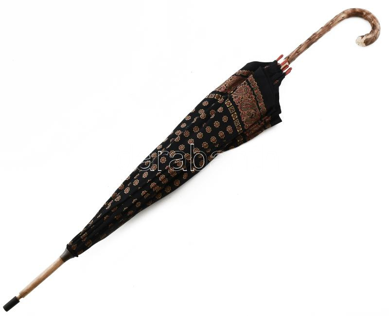 Leírás: Napernyő, sötét alapon mintás szövet ernyő, fa fogóval, h: 91 cm