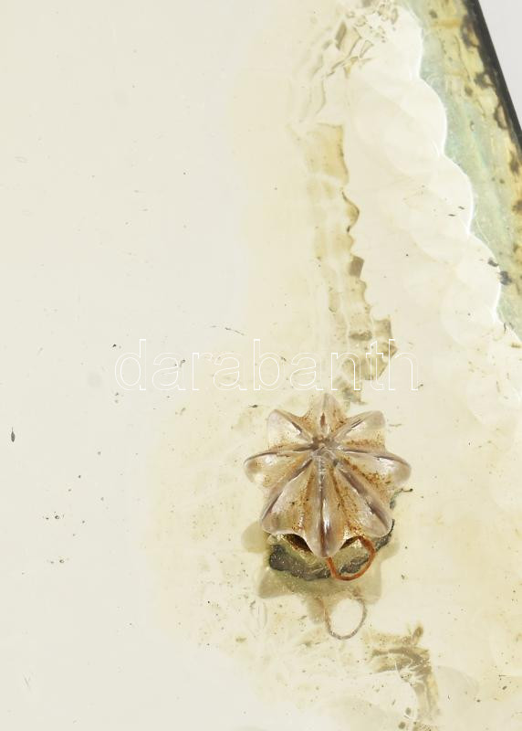 Leírás: Antik velencei tükör XIX. sz. falapra szerelve, díszes akasztóval 20,5x28,5 cm