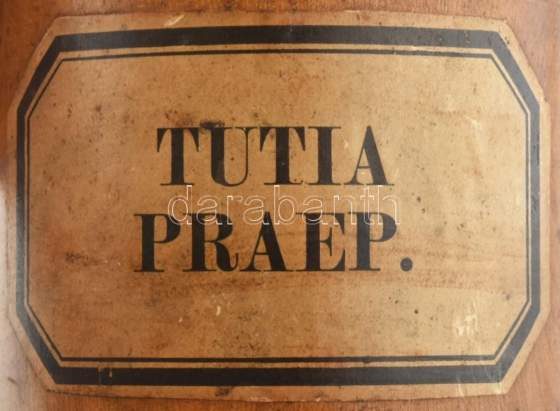 Leírás: Régi gyógyszertári fa edény. Feliratos 18 cm