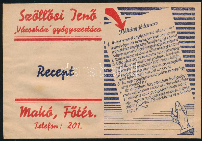 Szöllősi Jenő "Városház" gyógyszertára (Makó, Főtér) receptboríték https://www.darabanth.com/hu/449-Gyorsarveres/449.0/Mutargy-papirregiseg-egyeb/Reklam~500024/Szollosi-Jeno-Varoshaz-gyogyszertara-Mako-Foter-receptboritek~II2983302