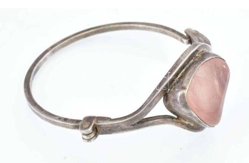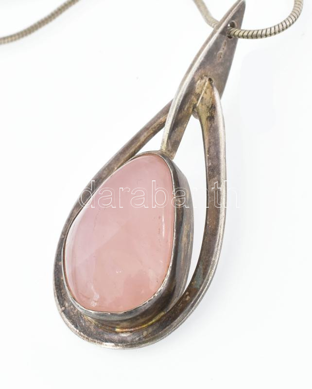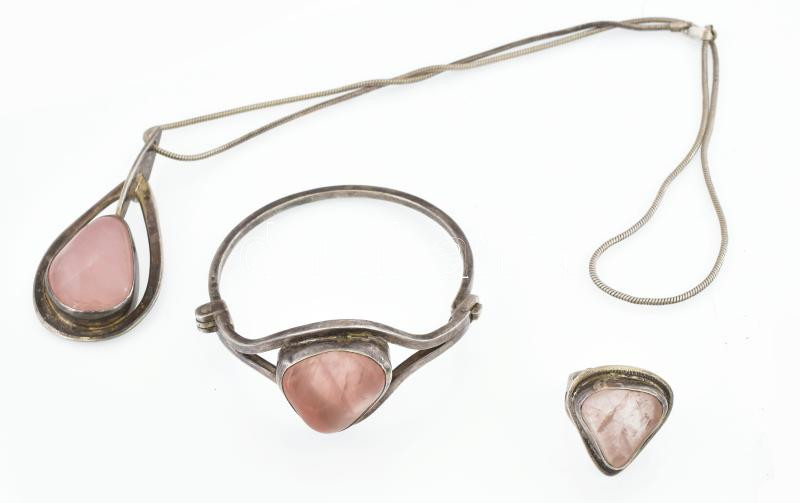 Leírás: Ezüst (Ag) designer ékszer szett rózsakvarccal. Karkötő, gyűrű, nyaklánc, medállal. Mind jelzett, mesterjegyes Össz br 109 g Kövek 2-3,5 cm-ig