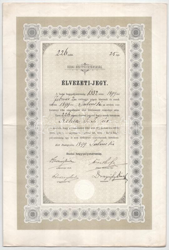 Budapest 1893. "Budai Hegypályatársaság" névre szóló élvezeti jegye 100Ft-ról, szelvénnyel, szárazpecséttel T:F / Hungary / Budapest 1893. "Budai Hegypályatársaság" share about 100 Forint, with coupon and embossed stamp C:F