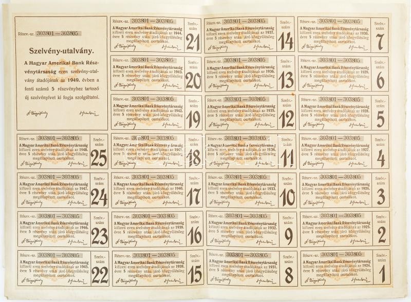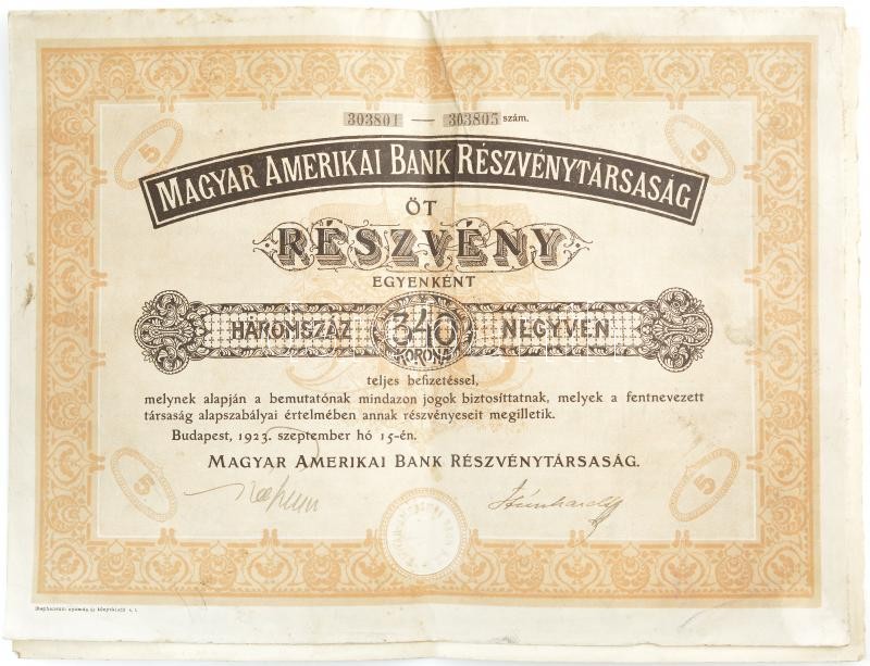 Leírás: Budapest 1923. "Magyar Amerikai Bank Részvénytársaság" 5 részvénye egyben, egyenként 340K-ról, szelvényekkel és szárazpecséttel T:III