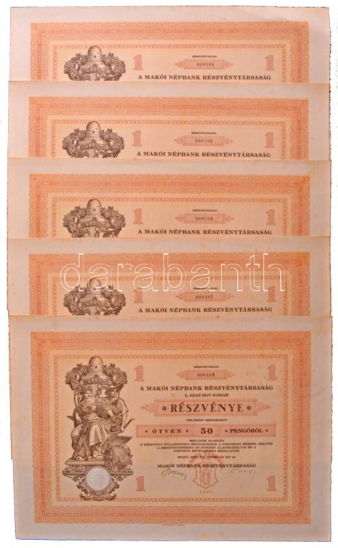 Leírás: Makó 1929. "Makói Népbank Részvénytársaság" részvénye 50P-ről szelvényekkel, szárazpecséttel (5x) sorszámkövetők T:AU