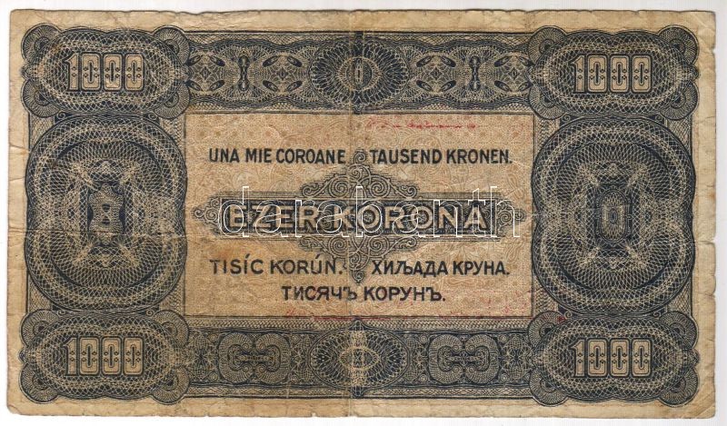 Leírás: 1923. 1000K 8f fny-sal, a felülnyomás igen erősen felfelé, illetve balra tolódott! T:III R!