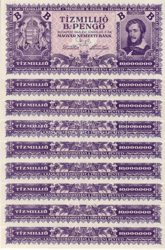 Leírás: 1946. 10.000.000B.-pengő (9x) ugyanolyan lemezhibával "sarkantyús L" T:I