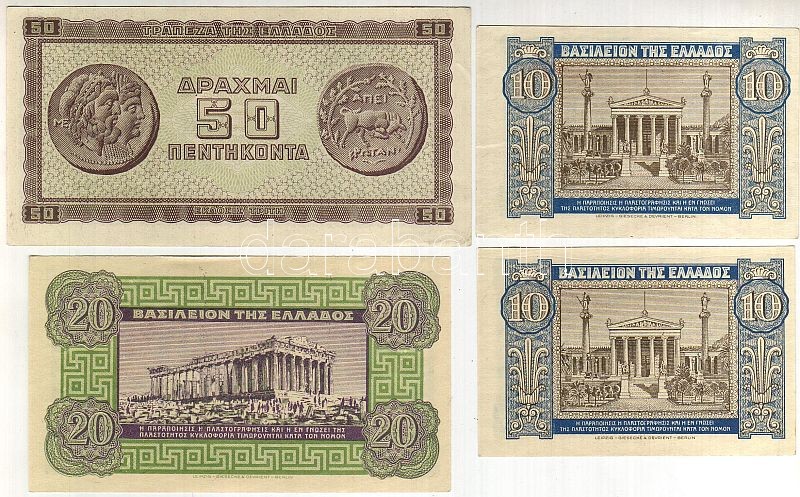 Leírás: Görögország 1940-43. 10Dr (2x) + 20Dr + 50Dr T:I