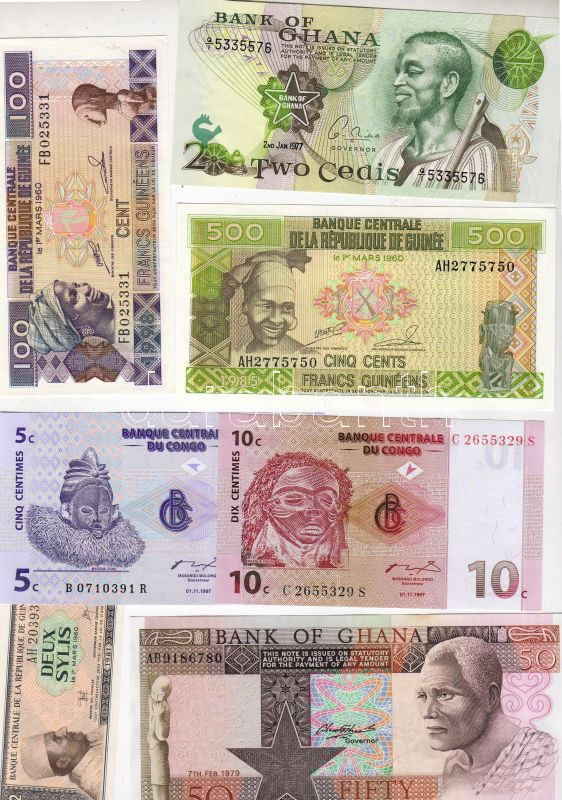 Leírás: Kongó (Brazzaville) 2 klf T:I Guinea 3 klf T:I, Ghana 3 klf bankjegy T:I