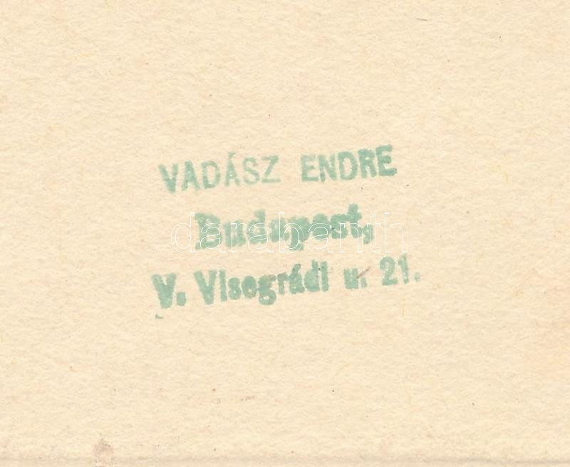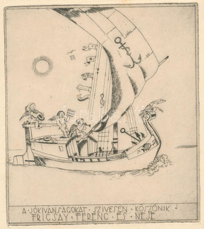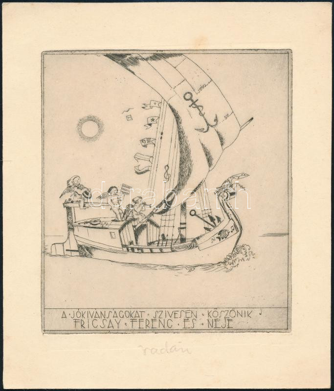 Vadász Endre (1901-1944): A zene hajója, Fricsay Ferenc karmesternek küldött jókívánságok megköszönése, rézkarc, papír, aláírt, pecséttel jelzett, szép állapotban, 12×11 cm