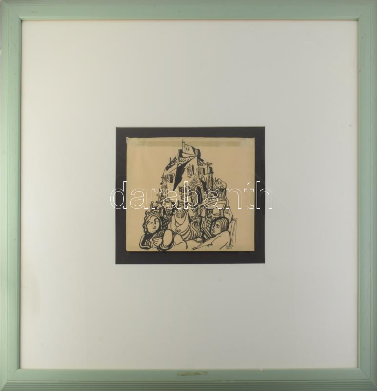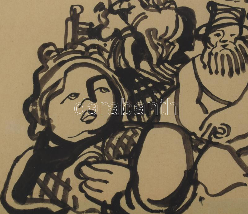 Kádár Béla (1877-1956): Forgatag. Tus, papír, jelezve jobbra lent, üvegezett fakeretben, 23,5x30 cm. Proveniencia: Korábban Tommy Vig (1938-) világhírű zenész gyűjteményében. / ink on paper, signed, framed. 23,5x30 cm.