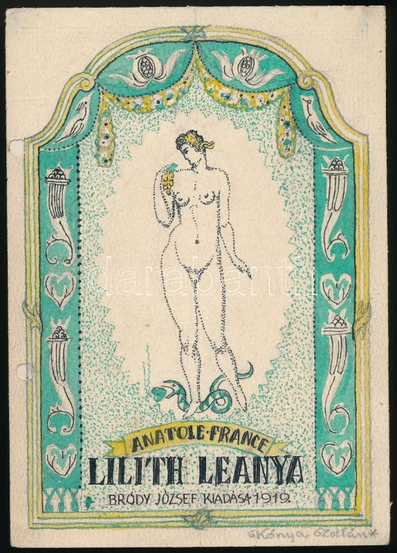 Kónya Zoltán (?-?): Könyvborító terve, Anatole France Lilith Leánya c.... https://www.darabanth.com/hu/45-Nagyaukcio/45.1/Festmenyek-es-grafikak/Klasszikus-festmenyek-es-grafikak~19000/Konya-Zoltan-Konyvborito-terve-Anatole-France-Lilith-Leanya-c-muvehez-1919-Vegye~II3446993