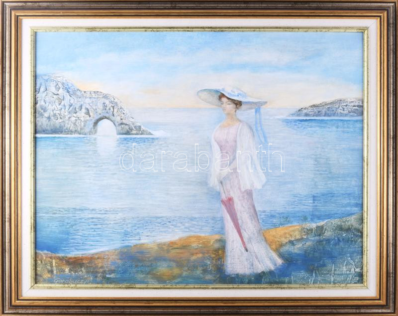 Leírás: Garabuczy Ágnes (1936-2020): Tengerparton. Olaj, farost, jelzett, hátoldalán Garabuczy Ágnes autográf feliratával, 50x60 cm, fakeretben