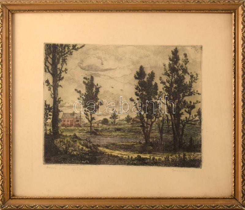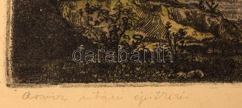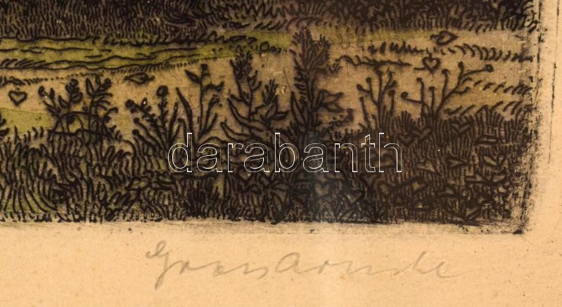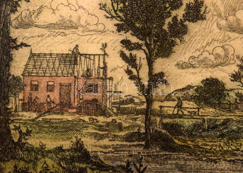 Leírás: Gross Arnold (1929-2015): Árvíz utáni építkezés. Színezett rézkarc, papír, jelzett. 18,5x24 cm Üvegezett fakeretben.
