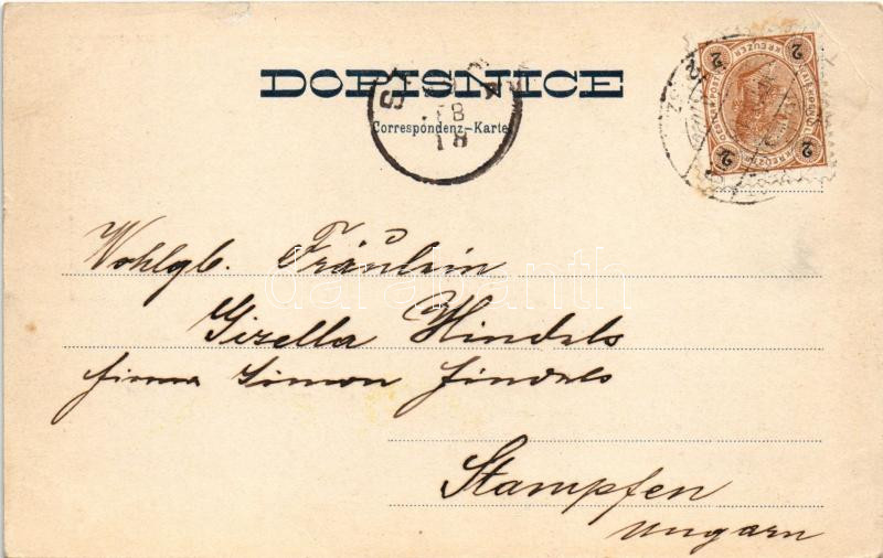 1899 (Vorläufer) Roznov pod Radhostem, Roznau; Zufahrt v. Bahnhof, Roznauer Teich / street from the railway station, pond with swans. J. Slovák (Kromeríz) Art Nouveau, floral (EB)