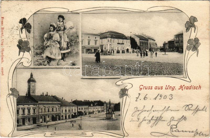 Leírás: 1903 Uherské Hradiste, Ungarisch Hradisch, Magyarhradis; square with shops, town hall. Art Nouveau, floral frame (EB)