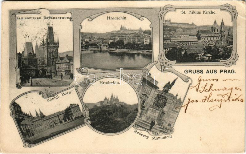 Leírás: 1905 Praha, Prag, Prága, Prague; Kleinseitner Brückenturm, Hradschin, St. Niklas Kirche, Königl. Burg, Radecky Monument / bridge tower, castle, church, monument. Art Nouveau, floral (EB)