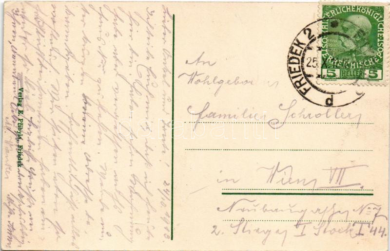 1913 Frydek, Frydek-Místek, Friedeck; Kaiser Franz Josefs Strasse, Marienkirche, Sparkassagebäude, Volks-Bürgerschule, K.k. Kronprinz Rudolf-Gymnasium, Fabriksviertel, Ringplatz / street, square, savings bank, school, factory district, market. Verlag E. Pribyla (EK)