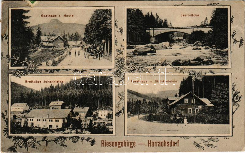 Leírás: 1916 Harrachov, Harrachsdorf (Krkonose, Riesengebirge); Gasthaus z. Maute, Iserbrücke, Brettsäge Johannistal, Forsthaus m. Strickerlehne / guest house, bridge, sawmill, forester's house, forestry. Floral (crease)