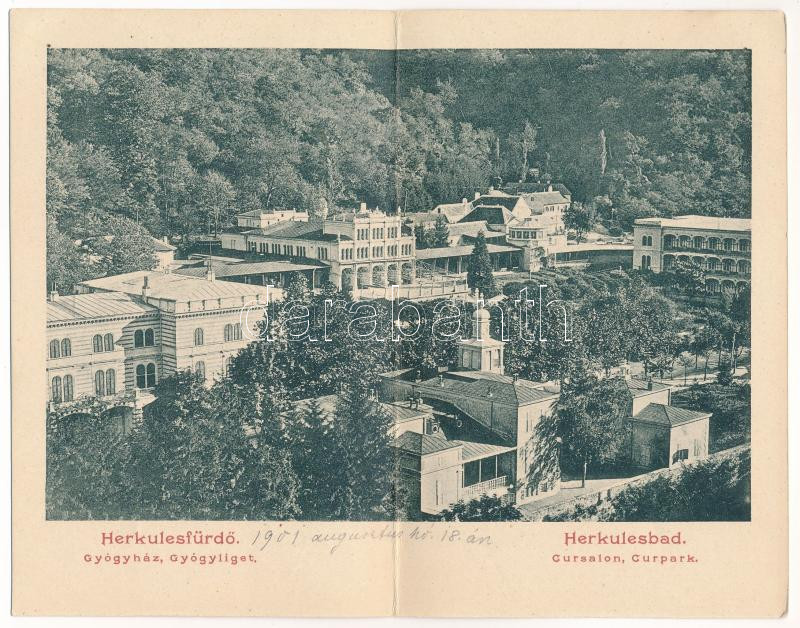 1901 Herkulesfürdő, Baile Herculane; gyógyház és gyógyliget. 2-részes ... https://www.darabanth.com/hu/45-Nagyaukcio/45.1/Kepeslapok/Erdely~18764/1901-Herkulesfurdo-Baile-Herculane-gyogyhaz-es-gyogyliget-2-reszes-kinyithato-panoramala~II3189979