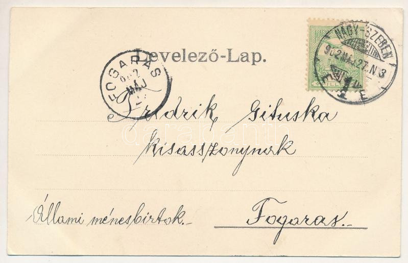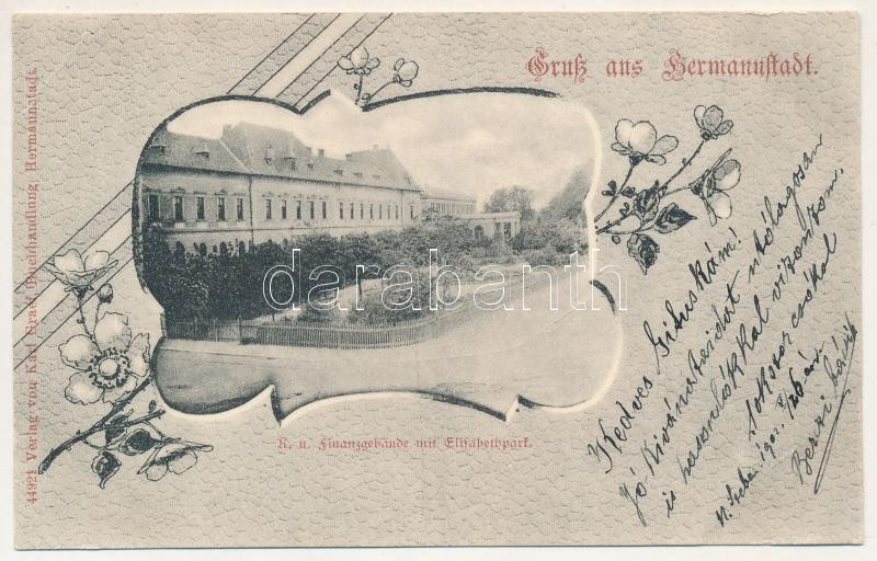 1902 Nagyszeben, Hermannstadt, Sibiu; K. u. Finanzgebäude mit Elisabethpark / Pénzügyigazgatóság és Erzsébet park. Karl Graef kiadása / financial palace, park. Art Nouveau, floral (EB)