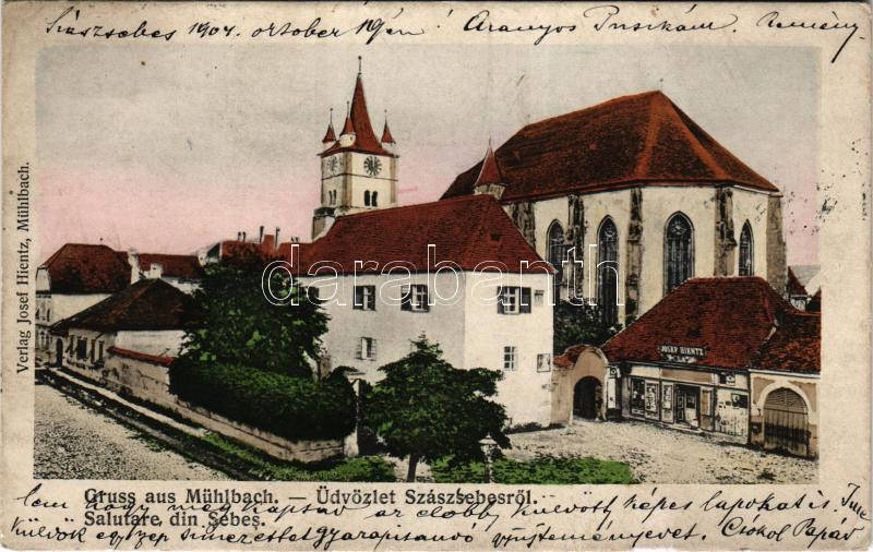 1904 Szászsebes, Mühlbach, Sebes; Evang. Kirche. Verlag A. Gross / evangélikus templom, Josef Hientz üzlete és saját kiadása / Lutheran church, shop (Rb)