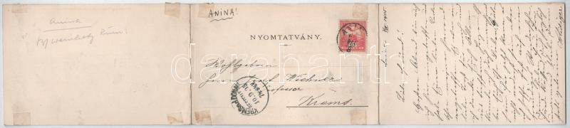 Leírás: 1905 Anina, Stájerlakanina, Stájerlak, Steierdorf; vasgyár teljes látképe. Három részes kihajtható panorámalap, Hubert Zs. kiadása, Honisch felvétele / iron works, factory. 3-tiled folding panoramacard (r)