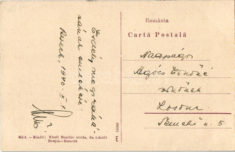 Leírás: 1940 Bereck, Bereczk, Bretcu; Biserica rom. cat. / Római katolikus templom, üzlet. Khell Bogdán fia László kiadása / Catholic church, shop (EK)