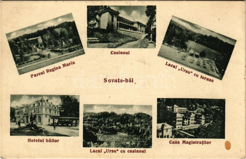 Szováta-fürdő, Sovata bai; Parcul Regina Maria, Casinoul, Hotelul Bailor, Lacul Ursu cu terasa, Casa Magistratilor / fürdő szálloda, park, kaszinó, villa / spa hotel, park, casino, villas (hullámos / wavy)