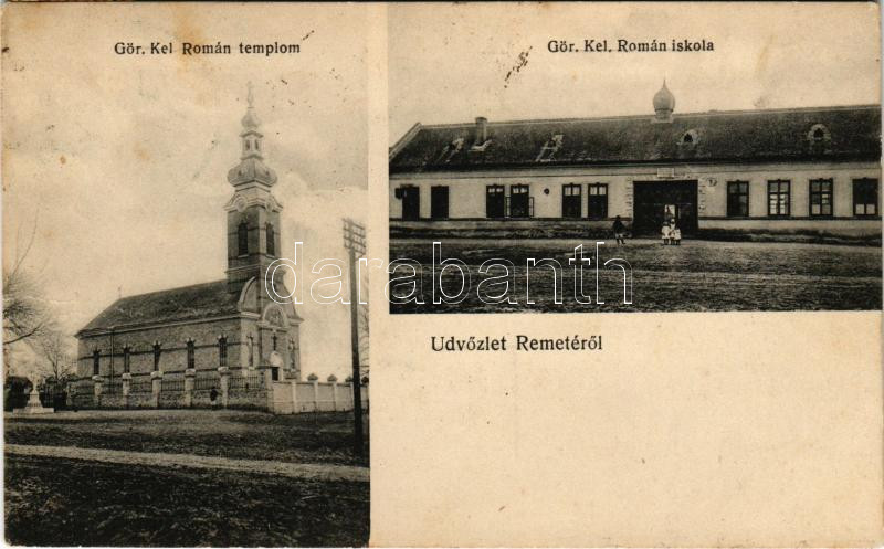 Temesremete, Remete, Remetea Mare; Görögkeleti román (ortodox) templom és iskola. Kalmár J. fényképész kiadása / Romanian Orthodox church and school (fl)