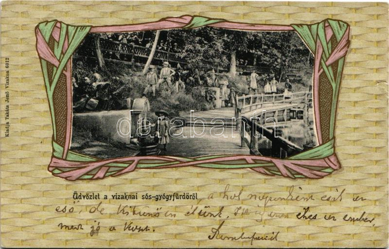 Leírás: Vízakna, Salzburg, Ocna Sibiului; sós-gyógyfürdő. Takáts Jenő kiadása, szecessziós litho keret / spa. Art Nouveau litho (szakadás / tear)