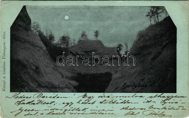 Leírás: 1899 Ipolyság, Sahy; Honti szakadás este holdfényben. Kanyó A. kiadása / ravine at night in moonlight (EM)