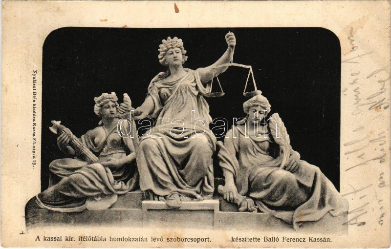1904 Kassa, Kosice; A királyi ítélőtábla homlokzatán lévő szoborcsopor... https://www.darabanth.com/hu/45-Nagyaukcio/45.1/Kepeslapok/Felvidek~18765/1904-Kassa-Kosice-A-kiralyi-itelotabla-homlokzatan-levo-szoborcsoport-keszitette-Ballo~II3419809