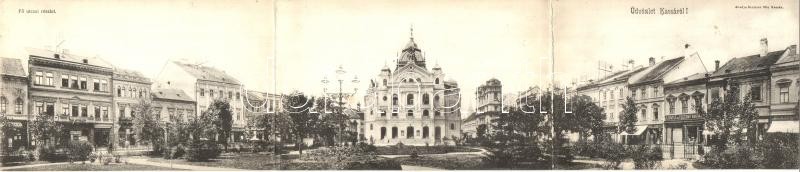 1905 Kasa, Kosice; Fő utca, színház, Dohány és szivarbolt, Szőnyeg és függöny raktár, Kluzsinszky K., Putankó Mihály, Quirsfeld és Binder Ernő üzlete. Három részes panorámalap / main street with shops. 3-tiled panoramacard