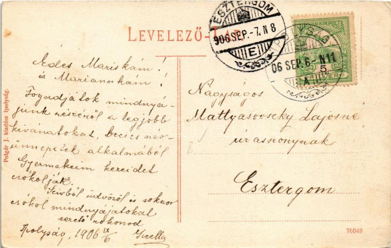 Leírás: 1906 Ipolyság, Sahy; Fő tér, Vármegyeháza, piac, üzletek. Polgár J. kiadása / main square, county hall, market, shops (kopott sarkak / worn corners)