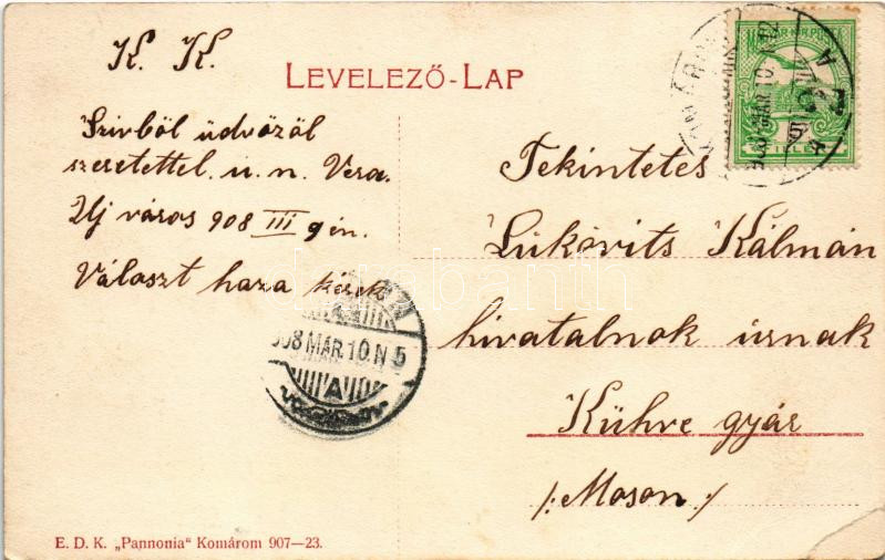 Leírás: 1908 Komárom, Komárno; Újváros, Lenfonoda. E.D.K. Pannonia 907-23. / flax spinning mill, factory (EB)