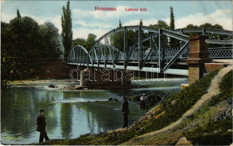 1914 Homonna, Humenné; Laborc híd, horgászó férfi, mosóasszonyok a folyó partján. Hossza Gyula kiadása / Laborec bridge, riverside with fishing man and washerwomen (EB)