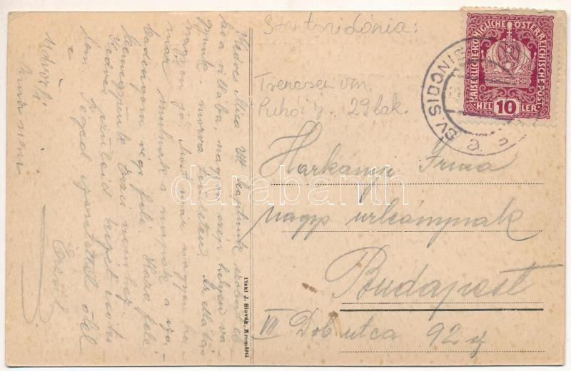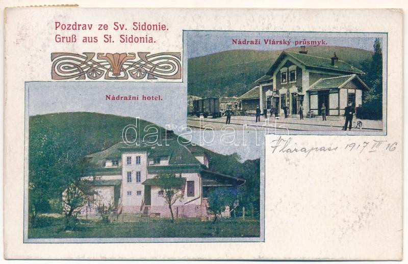1917 Felsőszernye, Felső-Szrnye, Horné Srnie (Trencsén); Sv. Sidonie, Nádrazí Vlársky prusmyk, Nádrazní hotel / Szent-Szidónia, Vlára-szoros vasútállomás, vasúti szálloda / Svatá Sidonie, railway station near Vlara Pass, railway hotel. Art Nouveau (EK)