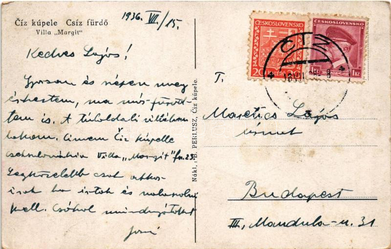 1936 Csízfürdő, Kúpele Cíz; Margit nyaraló. B. Perlusz / villa (EK) https://www.darabanth.com/hu/45-Nagyaukcio/45.1/Kepeslapok/Felvidek~18765/1936-Csizfurdo-Kupele-Ciz-Margit-nyaralo-B-Perlusz-villa-EK~II3455651