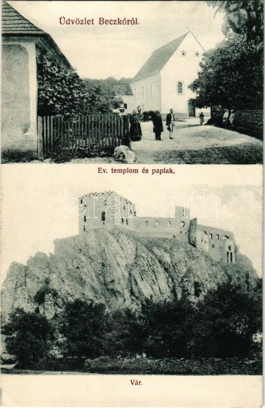 Leírás: Beckó, Beczkó, Beckov; Evangélikus templom és paplak, vár. Fogyasztási szövetkezet kiadása / Lutheran church and parish, castle ruins