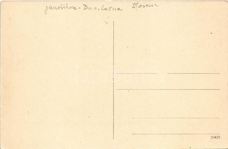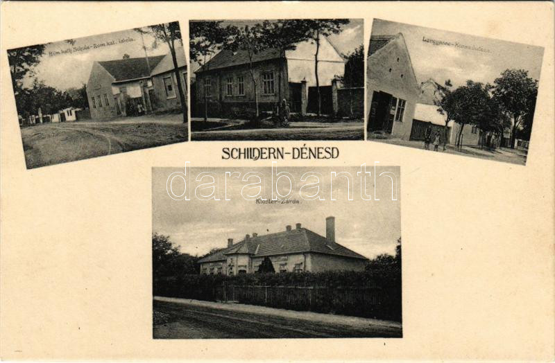 Dénesd, Schildern, Jánosíková (Dénesdtorcsmisérd, Dunajská Luzná); Római katolikus iskola, Hosszú utca, zárda / Röm. kath. Schule, Langgasse, Kloster / Catholic school, street, nunnery