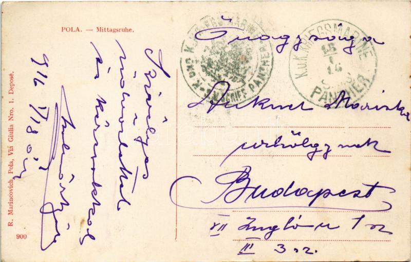 Leírás: 1916 Pola, Pula; Mittagsruhe. R. Marincovich / matrózok a fedélzeten / K.u.k. Navy mariners on board + "K.u.k. Kriegsmarine S.M.S. Panther" (hullámos / wavy)