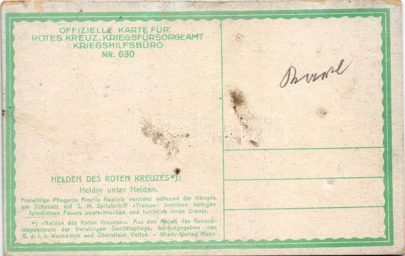 Heldin unter Helden. Freiwillige Pflegerin Amelia Rodinis versieht während der Kämpfe um Schabatz auf SM Spitalschiff "Traisen" inmitten heftigen feindlichen Feuers unerschrocken und furchtlos ihren Dienst. Helden des Roten Kreuzes. Offizielle Karte für Rotes Kreuz, Kriegsfürsorgeamt Kriegshilfsbüro Nr. 630. / SM Spitalschiff "TRAISEN" sebesültszállító kórházhajó. Dunaflottilla / WWI Austro-Hungarian Navy, SM Spitalschiff "Traisen" hospital ship in the K.u.K. Kriegsmarine Danube Fleet (Donauflottille). Red Cross heroine, volunteer nurse Amelia Rodinis does her duty fearlessly during the fights for Sabac, in the midst of fierce enemy fire s: Harry Heusser (r)