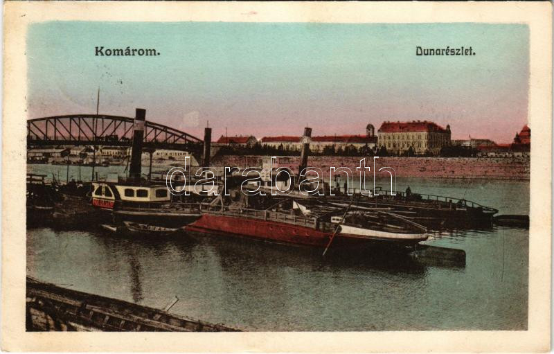 1915 Komárom, Komárno; Duna részlet, "TORONTÁL" oldalkerekes vontató gőzhajó, lebontott kerékállással, javításon a MFTR komáromi hajóműhelyében. A háború után jugoszláv hadizsákmány / TORONTÁL sidewheeler steam tug, undergoing repairs at the Komárno shipyard. Torontál was requisitioned for service on the Danube by the k.u.k. Zentraltransportleitung (ZTL). She was claimed as a war prize by the new Yugoslav state in 1918. (EK)