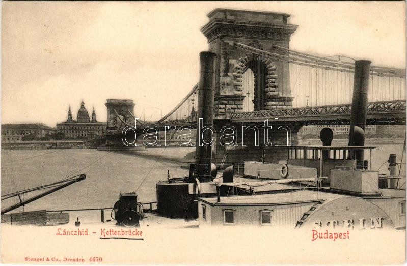 Budapest, Lánchíd. STEIN oldalkerekes vontató gőzhajó / "STEIN" Hungarian sidewheeler steam tug. She was requisitioned for service on the Danube by the k.u.k. Zentraltransportleitung (ZTL), but returned to the company after the First World War