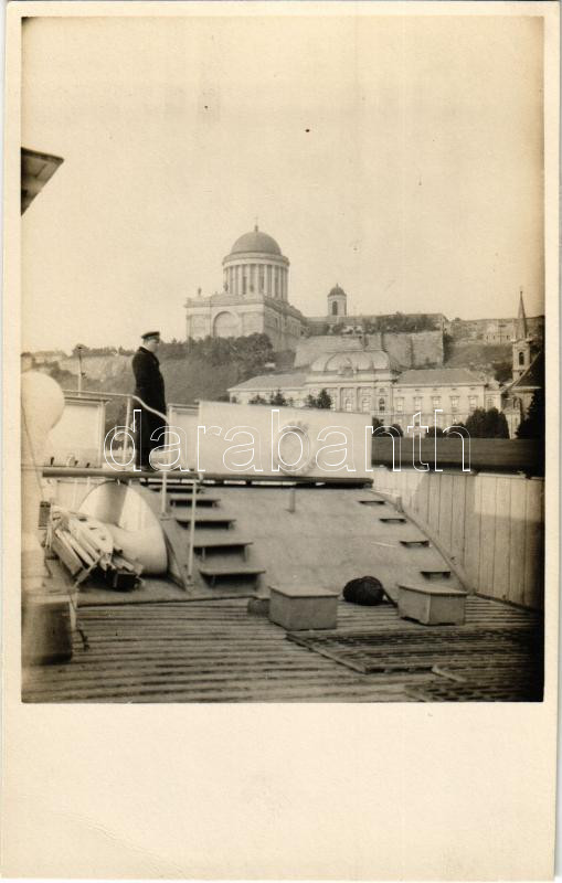Esztergom, Bazilika. "JOSEF CARL" DGT-HILDEGARDE típusú lapátkerekes gőzhajó fedélzete / Hungarian paddlewheeler passenger steamship. During the First World War, she was pressed into service by the k.u.k. Zentraltransportleitung (ZTL), photo (vágott / cut)