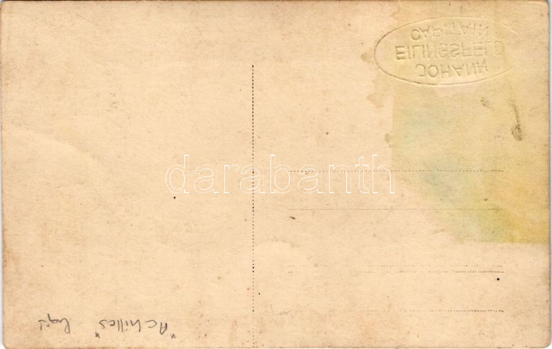 S. M. D. Achilles oldalkerekes gőzüzemű vontatóhajó télen a befagyott Dunán, Johann Eilingsfeld kapitány felvétele / "ACHILLES" paddle steamer tug in winter in the frozen Danube with the captain. Achilles was requisitioned in 1916 by the Zentraltransportleitung (ZTL) for service in the Danube. In 1918, she was returned to DDSG. In 1942, she was transferred to the Hrvatsko riječno brodarstvo of Zagreb, Croatia, and renamed Sava. In June 1944, the former Achilles was sunk by a mine near Surduk, in the Serbian Voivodina, at the Danube River kilometer marker 1,208.00. Johann Eilingsfeld Captain photo (b)